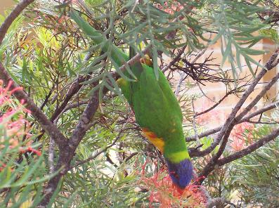 I took some pictures of the lorikeets in the front yard. Here is Australia, we have some really pretty native birds. These are Rainbow Lorikeets. Extremely pretty, but noisy as all hell. I'm telling you, the prettier the bird around here, the more horrible it sounds. These guys are not often seen alone. There are generally 2 or more together, and they feed in the native trees. Our villa complex has Grevillea bushes all up and down the driveway, with one only a yard or so from our bedroom window, and another one 2 yards from the loungeroom window. One day last week, there were several in each bush, squawking, arguing and chattering to each other at 5.30am. Loudly. Seriously, they never bloody shut up.